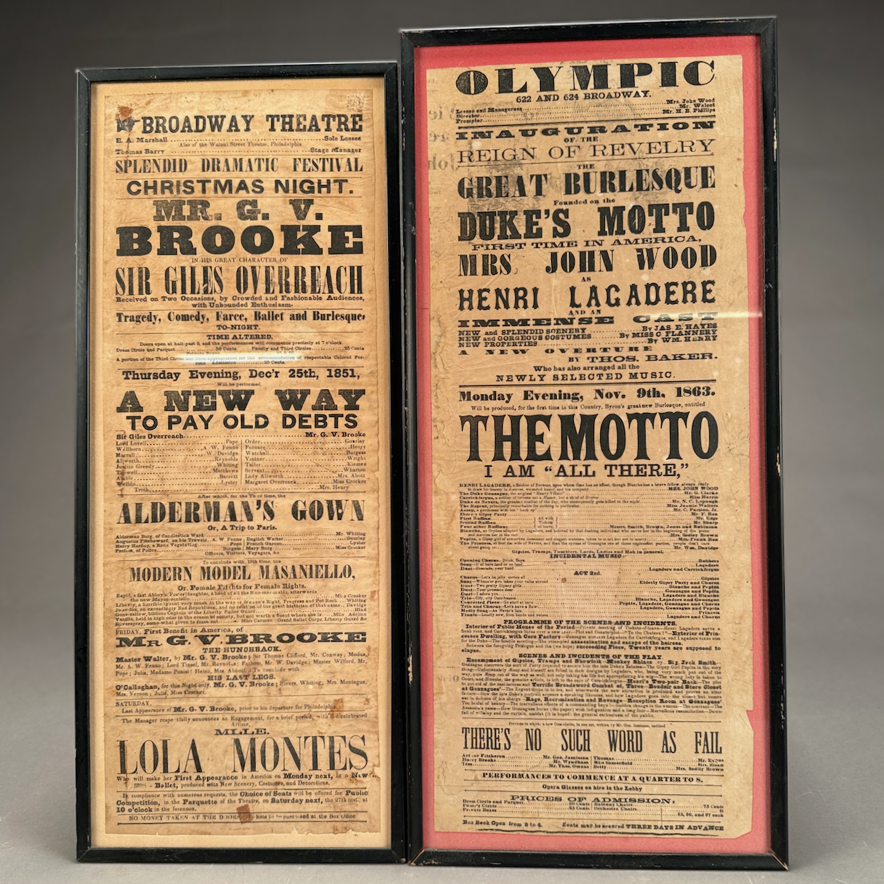 Home / ANTIQUE AUCTION - FRI NOVEMBER 7 AT 6 PM / LOT 244 TWO FRAMED BROADWAY THEATRE BROADSIDES, 1851 BROADWAY THEATRE AND 1863 OLYMPIC THEATRE. 21″ X 8 AND 21″ X 9 LOT 244 TWO FRAMED BROADWAY THEATRE BROADSIDES, 1851 BROADWAY THEATRE AND 1863 OLYMPIC THEATRE. 21″ X 8 AND 21″ X 9 Place a Bid Category: ANTIQUE AUCTION - FRI NOVEMBER 7 AT 6 PM Tag: auction Related products LOT 017 CONTINENTAL SILVER (.800) DRESSER BOX MARKED ON BASE ‘BEUTHNER’. 3-1/4″(H), 5-1/2″(W) X 4″(D), 8 OZT LOT 013 3 PCS OF STERLING SILVER: (1) OVAL DEEP SERVING DISH BY E. CALDWELL & CO, 10 X 6-1/2. (2) PORRINGER BY DOMINICK & HAFF, 7″. (3) PORRINGER BY RWM, 6″. 21.8 OZT LOT 011 4 PCS OF ENGLISH STERLING SILVER. (1) EXPANDING TOAST RACK, 1901-1902, LONDON, 3″(H). (2) 3″ TEA CADDY SPOON, 1796-7, LONDON. (3) 7″ RETICULATED 2 HANDLED DISH, 1906-7, BIRMINGHAM. (4) 2″(H) TANKARD SHAPED MUSTARD WITH COBALT LINER, 1902-3, BIRMINGHAM. 12.6 OZT (W/O LINER) LOT 019 COIN SILVER MUG BY C. BARD & SON, PHILADELPHIA, PA, CIRCA 1850 INSCRIBED ‘ANNA CRAIG FULTON’, THE BODY HAVING REPOUSSE FLOWERS. 3-1/2″(H), 3.3 OZT