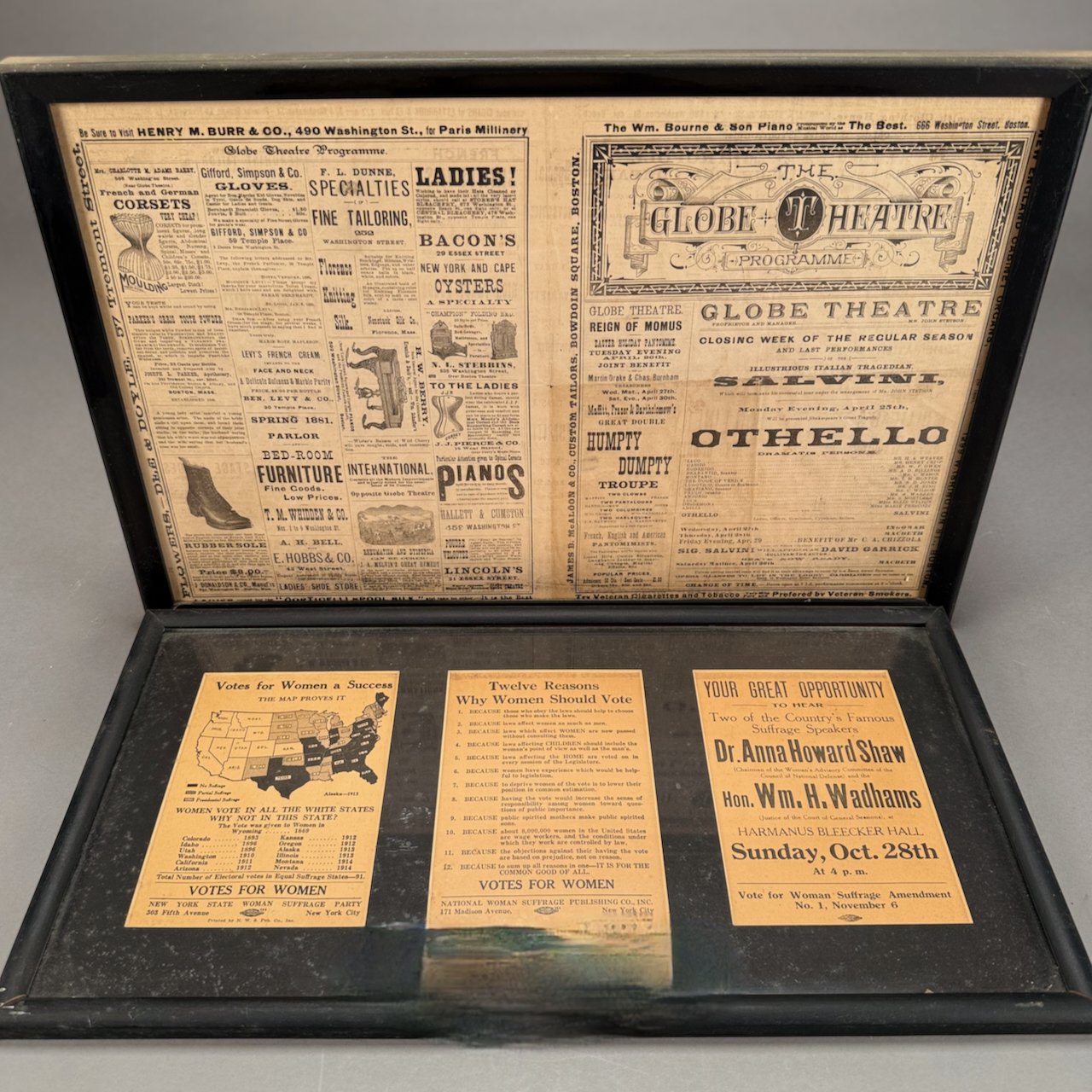 Home / ANTIQUE AUCTION - FRI NOVEMBER 7 AT 6 PM / LOT 245 TWO FRAMED ITEMS: (1) GLOBE THEATRE PROGRAMME 1881, 12 X 19 SIGHT SIZE. (2) 3-PART SUFFRAGE LECTURE, 6-1/2 X 4-1/2 EACH LOT 245 TWO FRAMED ITEMS: (1) GLOBE THEATRE PROGRAMME 1881, 12 X 19 SIGHT SIZE. (2) 3-PART SUFFRAGE LECTURE, 6-1/2 X 4-1/2 EACH Place a Bid Category: ANTIQUE AUCTION - FRI NOVEMBER 7 AT 6 PM Tag: auction Related products LOT 018 COIN SILVER HANDLED CUP, PROBABLY FREEMAN & WALLIN, PHILADELPHIA, CIRCA 1850. 4″(H), 3.6 OZT. LOT 001 PAIR OF STERLING SILVER COLUMN CANDLESTICKS BY GORHAM MARKED A3207 EACH HAVING REMOVABLE BOBECHES. 10-1/4″(H) LOT 020 STERLING SILVER HINGED SQUARE BOX, LONDON, 1806, MAKERS MARK RH?, THE LID WITH A REPOUSSE SCENE OF 2 MEN PLAYING A BOARD GAME. 1-1/4″(H), 4″(W), 4″(D) LOT 021 OSCAR BERNINGHAUS, ‘THE ROAD TO TAOS’, OIL ON CANVAS, SIGNED LOWER RIGHT, GILT FRAME WITH ARTIST PLAQUE. ON REVERSE OF FRAME IS A PENNSYLVANIA ACADEMY OF THE FINE ART LABEL FOR THEIR 109TH ANNUAL ART EXHIBITION WITH TITLE AND ARTIST (1914). 24 X 36