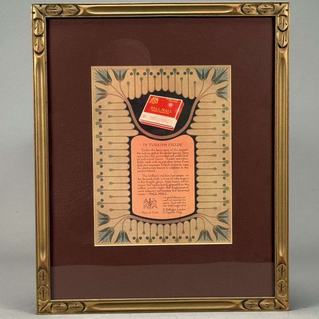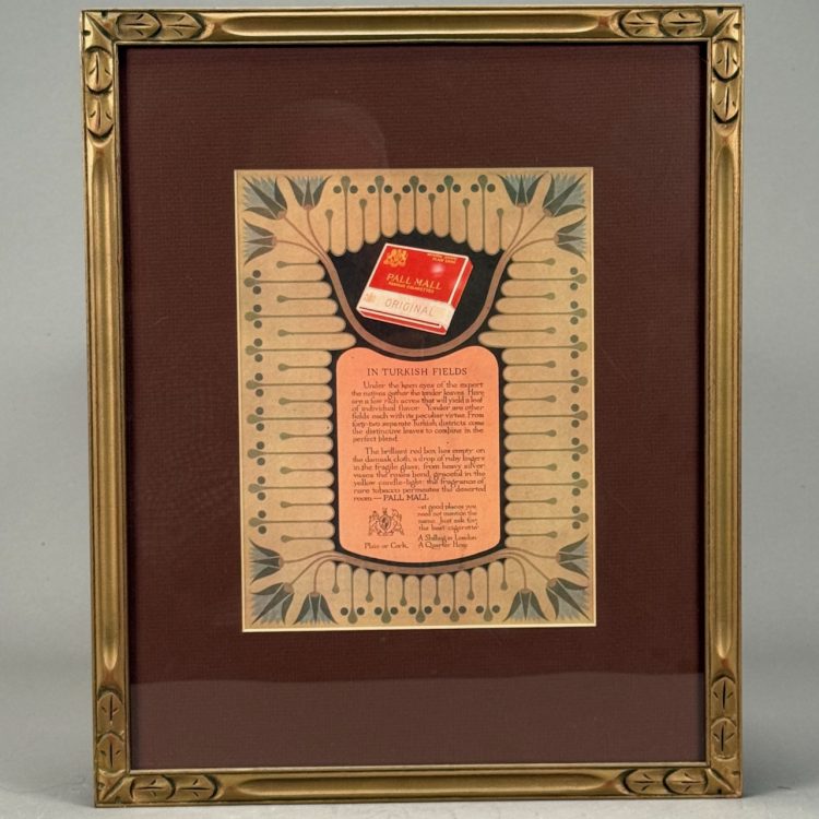Home / ANTIQUE AUCTION - FRI OCTOBER 3 AT 6 PM / LOT 263 FRAMED ADVERTISEMENT FOR PALL MALL CIGARETTES WITH ART NOUVEAU DESIGN. 10 X 7-1/2 SIGHT SIZE LOT 263 FRAMED ADVERTISEMENT FOR PALL MALL CIGARETTES WITH ART NOUVEAU DESIGN. 10 X 7-1/2 SIGHT SIZE Place a Bid Categories: ANTIQUE AUCTION - FRI OCTOBER 3 AT 6 PM, OCTOBER 3 AT 6 PM Tag: auction Related products LOT 022 STEPHEN G. MANIATTY, ‘BUCKET OF POSIES’, OIL ON CANVAS, SIGNED LOWER RIGHT, FRAMED. 38 X 36 LOT 010 2 STERLING SILVER SHAKERS, ONE 6″(H) WITH BLURRED ENGLISH HALLMARKS, THE OTHER 6-1/2″(H) MARKED STERLING. 9 OZT LOT 019 COIN SILVER MUG BY C. BARD & SON, PHILADELPHIA, PA, CIRCA 1850 INSCRIBED ‘ANNA CRAIG FULTON’, THE BODY HAVING REPOUSSE FLOWERS. 3-1/2″(H), 3.3 OZT LOT 024 STEPHEN G. MANIATTY, ‘OCTOBERS GIFT’, OIL ON CANVAS, SIGNED LOWER RIGHT, FRAMED. 34 X 25