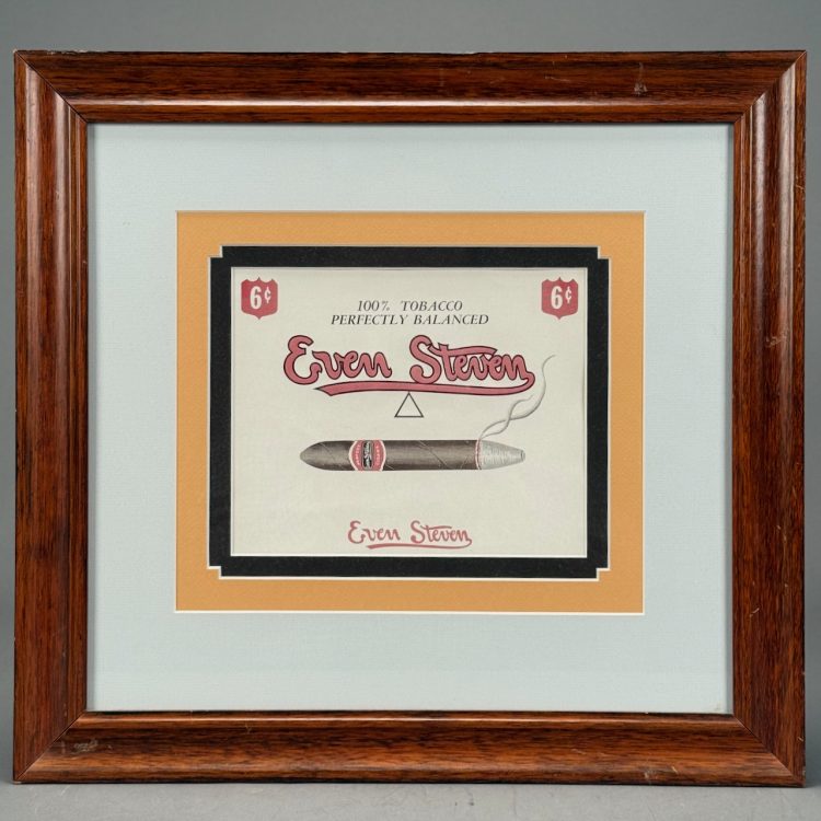 Home / OCTOBER 3 AT 6 PM / LOT 270 FRAMED ORIGINAL CIGAR BOX LABEL, “EVEN STEVEN”. 7 X 8 SIGHT SIZE LOT 270 FRAMED ORIGINAL CIGAR BOX LABEL, “EVEN STEVEN”. 7 X 8 SIGHT SIZE Place a Bid Categories: ANTIQUE AUCTION - FRI OCTOBER 3 AT 6 PM, OCTOBER 3 AT 6 PM Tag: auction Related products LOT 024 STEPHEN G. MANIATTY, ‘OCTOBERS GIFT’, OIL ON CANVAS, SIGNED LOWER RIGHT, FRAMED. 34 X 25 LOT 009 48 PC STERLING SILVER FLATWARE SET IN THE “KING GEORGE” PATTERN BY GORHAM, 57 OZT (WITHOUT 16 KNIVES) MONOGRAMMED LOT 017 CONTINENTAL SILVER (.800) DRESSER BOX MARKED ON BASE ‘BEUTHNER’. 3-1/4″(H), 5-1/2″(W) X 4″(D), 8 OZT LOT 015 42 PC STERLING FLATWARE SET BY LUNT IN THE ‘WILLIAM & MARY’ PATTERN, NO MONOGRAM. 34.5 OZT (W/O 12 KNIVES)