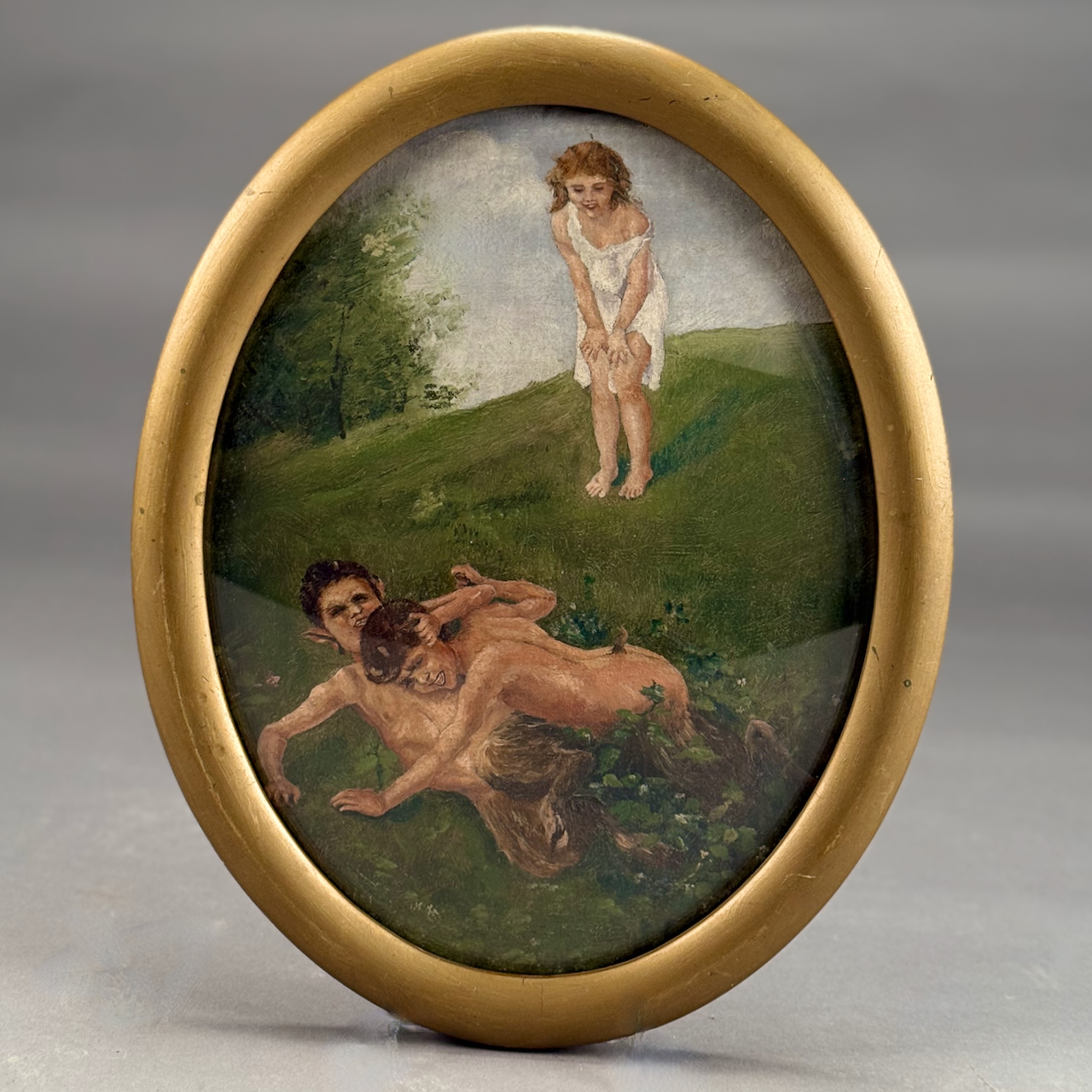 Home / ANTIQUE ESTATE AUCTION - FRI MARCH 27 AT 6 PM / LOT 278 UNSIGNED, TWO PANS WRESTLING WHILE YOUNG GIRL WATCHES, OIL ON BOARD, OVAL FRAME. 13-3/4 X 10-3/4 LOT 278 UNSIGNED, TWO PANS WRESTLING WHILE YOUNG GIRL WATCHES, OIL ON BOARD, OVAL FRAME. 13-3/4 X 10-3/4 Place a Bid Category: ANTIQUE ESTATE AUCTION - FRI MARCH 27 AT 6 PM Tag: auction Related products LOT 022 STEPHEN G. MANIATTY, ‘BUCKET OF POSIES’, OIL ON CANVAS, SIGNED LOWER RIGHT, FRAMED. 38 X 36 LOT 021 OSCAR BERNINGHAUS, ‘THE ROAD TO TAOS’, OIL ON CANVAS, SIGNED LOWER RIGHT, GILT FRAME WITH ARTIST PLAQUE. ON REVERSE OF FRAME IS A PENNSYLVANIA ACADEMY OF THE FINE ART LABEL FOR THEIR 109TH ANNUAL ART EXHIBITION WITH TITLE AND ARTIST (1914). 24 X 36 LOT 013 3 PCS OF STERLING SILVER: (1) OVAL DEEP SERVING DISH BY E. CALDWELL & CO, 10 X 6-1/2. (2) PORRINGER BY DOMINICK & HAFF, 7″. (3) PORRINGER BY RWM, 6″. 21.8 OZT LOT 002 3 PC STERLING SILVER TEA SET BY GORHAM CONSISTING OF 10″ TEAPOT (2441), 6-1/2″ CREAMER (2444), 6″ COVERED SUGAR (2443), 45 OZT