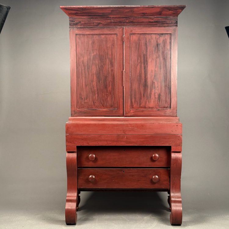 Home / OCTOBER 3 AT 6 PM / LOT 282 TWO PART EMPIRE SECRETARY IN RED WASH. 76-1/2″(H), 40″(W), 19″(D) LOT 282 TWO PART EMPIRE SECRETARY IN RED WASH. 76-1/2″(H), 40″(W), 19″(D) Place a Bid Categories: ANTIQUE AUCTION - FRI OCTOBER 3 AT 6 PM, OCTOBER 3 AT 6 PM Tag: auction Related products LOT 001 PAIR OF STERLING SILVER COLUMN CANDLESTICKS BY GORHAM MARKED A3207 EACH HAVING REMOVABLE BOBECHES. 10-1/4″(H) LOT 007 FIXED HANDLED STERLING SILVER LOW BASKET MARKED BIGELOW, KENNARD & CO. 5-1/2″(H), 10-1/2″(D), 9.8 OZT LOT 023 STEPHEN G. MANIATTY, ‘SAWMILL’, OIL ON CANVAS, SIGNED LOWER RIGHT, FRAMED WITH AN AWARD PLAQUE “GRUMBACHER ARTISTS MATERIAL AWARD/GRAND NATIONAL EXHIBITION/NEW YORK CITY – 1965”. 20 X 30 LOT 021 OSCAR BERNINGHAUS, ‘THE ROAD TO TAOS’, OIL ON CANVAS, SIGNED LOWER RIGHT, GILT FRAME WITH ARTIST PLAQUE. ON REVERSE OF FRAME IS A PENNSYLVANIA ACADEMY OF THE FINE ART LABEL FOR THEIR 109TH ANNUAL ART EXHIBITION WITH TITLE AND ARTIST (1914). 24 X 36