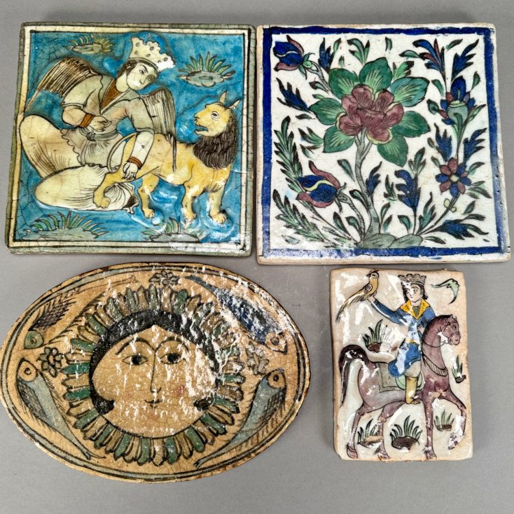 Home / ANTIQUE AUCTION - FRI OCTOBER 3 AT 6 PM / LOT 286 FOUR DECORATIVE TILES: (1) 7 X 5 KING ON HORSE HOLDING BIRD. (2) 11-1/2 X 8 OVAL FACE WITH FISH. (3) 9-1/2 X 9-1/2 KING WITH LION. (4) 9-1/2 X 9-1/2 FLOWER LOT 286 FOUR DECORATIVE TILES: (1) 7 X 5 KING ON HORSE HOLDING BIRD. (2) 11-1/2 X 8 OVAL FACE WITH FISH. (3) 9-1/2 X 9-1/2 KING WITH LION. (4) 9-1/2 X 9-1/2 FLOWER Place a Bid Categories: ANTIQUE AUCTION - FRI OCTOBER 3 AT 6 PM, OCTOBER 3 AT 6 PM Tag: auction Related products LOT 016 6 PCS OF STERLING SILVER: (1) 6″(D) PLATE BY TOWLE. (2) 3-1/2 FOOTED CREAMER BY POOLE. (3) 4″(D) FOOTED BOWL BY SHREVE, CRUMP & LOW CO (4) 7″(L) FOOTED GRAVY BY J.E. CALDWELL & CO (5) 4″ CREAMER BY DOMINICK & HAFF (6) 6-3/4″(W) DISH BY TOWLE. 25.2 OZT LOT 006 FINE PAIR OF FANCY STERLING SILVER CANDLESTICKS, SHEFFIELD, 1903-4 WITH MAKER’S MARK ‘HE LD’, 12″(H) LOT 019 COIN SILVER MUG BY C. BARD & SON, PHILADELPHIA, PA, CIRCA 1850 INSCRIBED ‘ANNA CRAIG FULTON’, THE BODY HAVING REPOUSSE FLOWERS. 3-1/2″(H), 3.3 OZT LOT 010 2 STERLING SILVER SHAKERS, ONE 6″(H) WITH BLURRED ENGLISH HALLMARKS, THE OTHER 6-1/2″(H) MARKED STERLING. 9 OZT