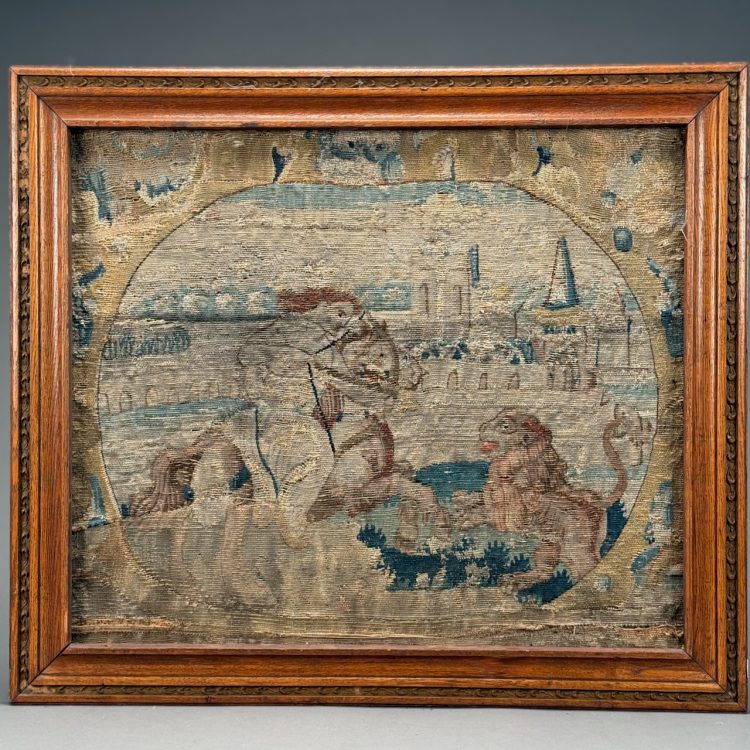 Home / OCTOBER 3 AT 6 PM / LOT 310 FRAMED EARLY TAPESTRY DEPICTING A FIGURE ON HORSEBACK SLAYING A REARING LION WITH BUILDING IN BACKGROUND. 22 X 26 SIGHT SIZE LOT 310 FRAMED EARLY TAPESTRY DEPICTING A FIGURE ON HORSEBACK SLAYING A REARING LION WITH BUILDING IN BACKGROUND. 22 X 26 SIGHT SIZE Place a Bid Categories: ANTIQUE AUCTION - FRI OCTOBER 3 AT 6 PM, OCTOBER 3 AT 6 PM Tag: auction Related products LOT 011 4 PCS OF ENGLISH STERLING SILVER. (1) EXPANDING TOAST RACK, 1901-1902, LONDON, 3″(H). (2) 3″ TEA CADDY SPOON, 1796-7, LONDON. (3) 7″ RETICULATED 2 HANDLED DISH, 1906-7, BIRMINGHAM. (4) 2″(H) TANKARD SHAPED MUSTARD WITH COBALT LINER, 1902-3, BIRMINGHAM. 12.6 OZT (W/O LINER) LOT 018 COIN SILVER HANDLED CUP, PROBABLY FREEMAN & WALLIN, PHILADELPHIA, CIRCA 1850. 4″(H), 3.6 OZT. LOT 020 STERLING SILVER HINGED SQUARE BOX, LONDON, 1806, MAKERS MARK RH?, THE LID WITH A REPOUSSE SCENE OF 2 MEN PLAYING A BOARD GAME. 1-1/4″(H), 4″(W), 4″(D) LOT 001 PAIR OF STERLING SILVER COLUMN CANDLESTICKS BY GORHAM MARKED A3207 EACH HAVING REMOVABLE BOBECHES. 10-1/4″(H)