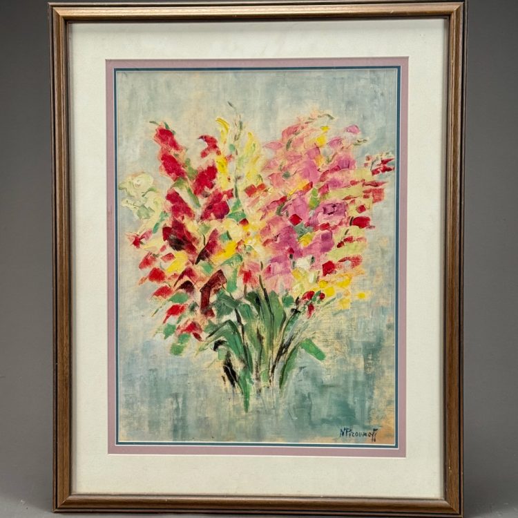 Home / ANTIQUE AUCTION - FRI OCTOBER 3 AT 6 PM / LOT 312 N. PIZOUMOFF, FLOWER STILL LIFE, OIL ON CANVAS, FRAMED BEHIND GLASS, SIGNED LOWER RIGHT. 19-1/2 X 14-1/2 SIGHT SIZE LOT 312 N. PIZOUMOFF, FLOWER STILL LIFE, OIL ON CANVAS, FRAMED BEHIND GLASS, SIGNED LOWER RIGHT. 19-1/2 X 14-1/2 SIGHT SIZE Place a Bid Categories: ANTIQUE AUCTION - FRI OCTOBER 3 AT 6 PM, OCTOBER 3 AT 6 PM Tag: auction Related products LOT 004 133 PC STERLING SILVER FLATWARE SET IN THE “KING PATTERN. 190 OZT (EXCLUDING 12 KNIVES), MONOGRAMMED LOT 011 4 PCS OF ENGLISH STERLING SILVER. (1) EXPANDING TOAST RACK, 1901-1902, LONDON, 3″(H). (2) 3″ TEA CADDY SPOON, 1796-7, LONDON. (3) 7″ RETICULATED 2 HANDLED DISH, 1906-7, BIRMINGHAM. (4) 2″(H) TANKARD SHAPED MUSTARD WITH COBALT LINER, 1902-3, BIRMINGHAM. 12.6 OZT (W/O LINER) LOT 001 PAIR OF STERLING SILVER COLUMN CANDLESTICKS BY GORHAM MARKED A3207 EACH HAVING REMOVABLE BOBECHES. 10-1/4″(H) LOT 018 COIN SILVER HANDLED CUP, PROBABLY FREEMAN & WALLIN, PHILADELPHIA, CIRCA 1850. 4″(H), 3.6 OZT.
